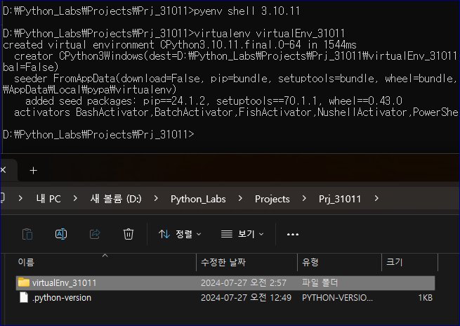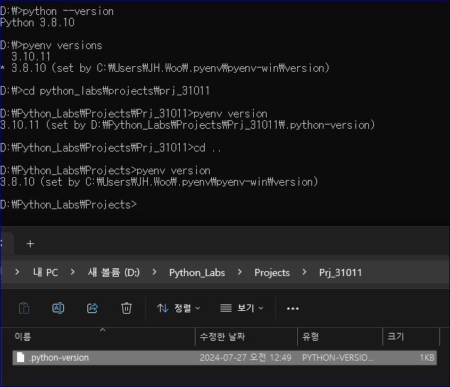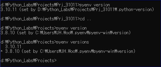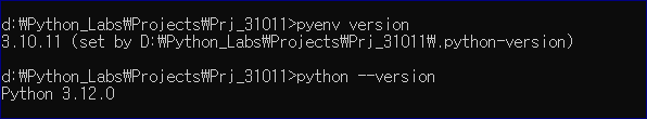 pyenv local 3.10.11 명령어를 실행시키고 pyenv version 을 실행시켜서 현재 Prj_31011 폴더에서 사용중인 python 버전이 아래와 같이 3.10.11 이 설정된 모습을 볼 수 있습니다.