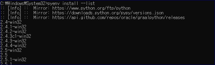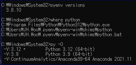 다른 where python 이나 py -0 명령어로 조회해 보면 pyenv 를 사용해서 등록한 python 의 모습은 볼 수가 없습니다.