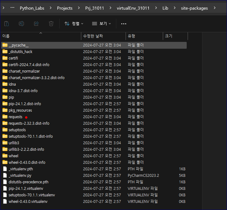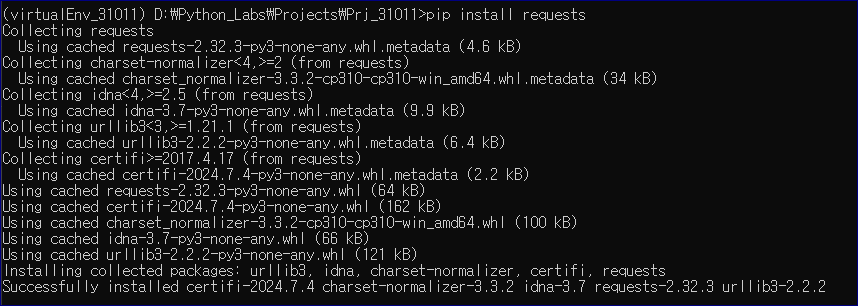 설치하고 나면 \virtualEnv_31011\Lib\site-packages 폴더내에 request 관련 libray 들이 설치되어 있는 것을 확인할 수 있습니다.