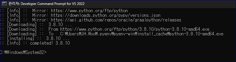 pyenv-win을 사용하여 원하는 버전의 Python을 설치합니다. 예를 들어, Python 3.8.10 을 설치합니다.