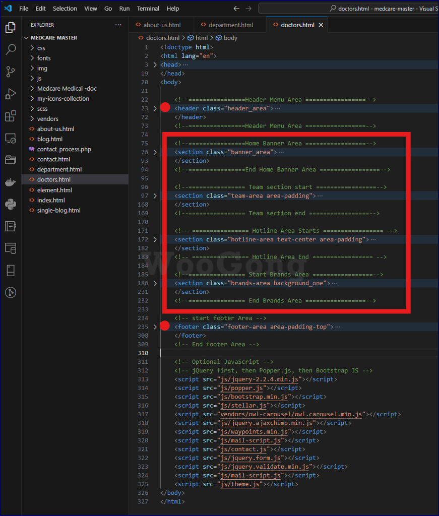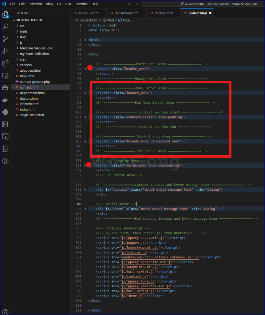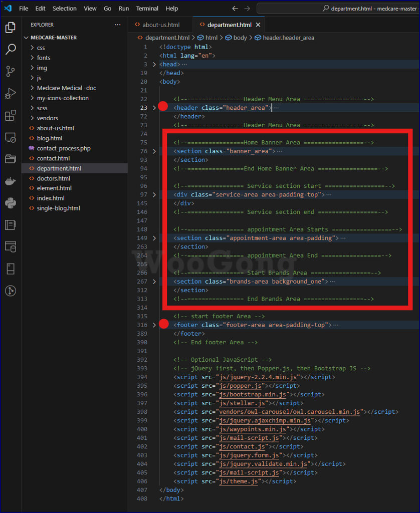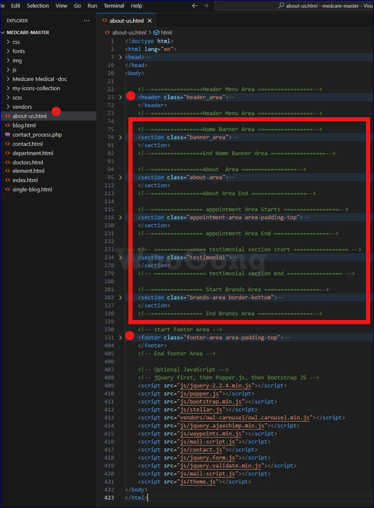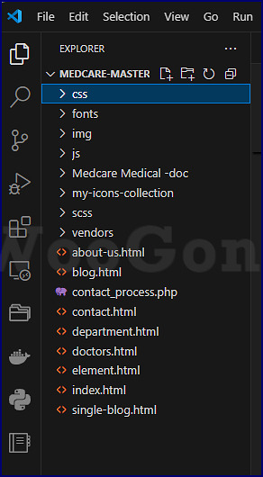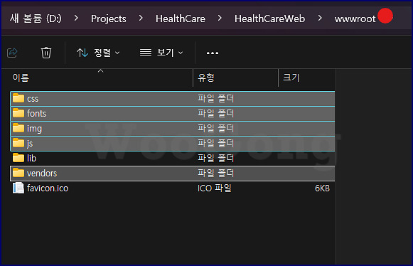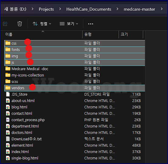 "Medcare" Template Source 에서 아래 그림과 같이 "css, fonts, img, js, vendors" 폴더를 복사합니다.
