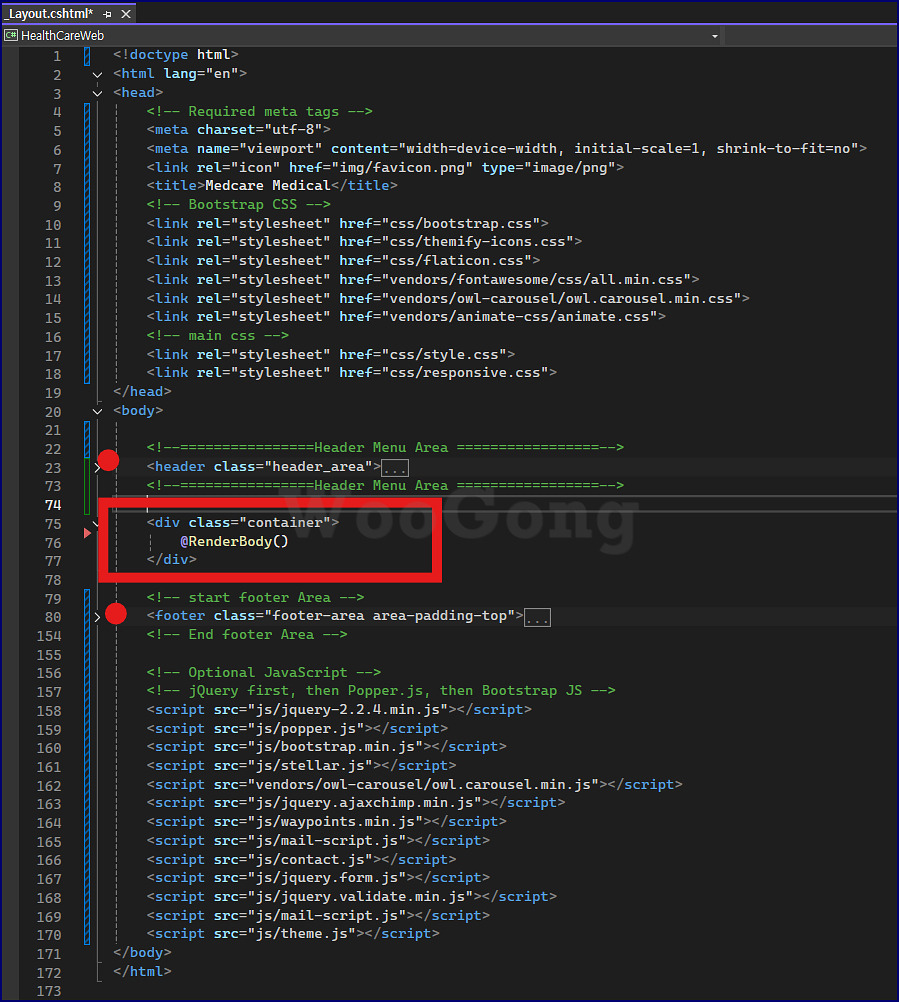 "Medcare" template을 이용한 MVC Web Application 구축, 다섯 번째 입니다. 지난 4편에서는 각 메뉴의 기본적인 뼈대인 Controller와 해당 controller 의 index ActionMethod 에 대응하는index.cshtml View 파일을 만드는 과정을 살펴봤습니다. 이제 웹사이트의 기본적인 구조를 갖추었으니, 이번 편에서는 모든 페이지에 공통으로 적용될 Layout 을 template 에서 어떻게 가져와서 _Layout.cshtml 파일을 구성하는지 살펴보겠습니다.
