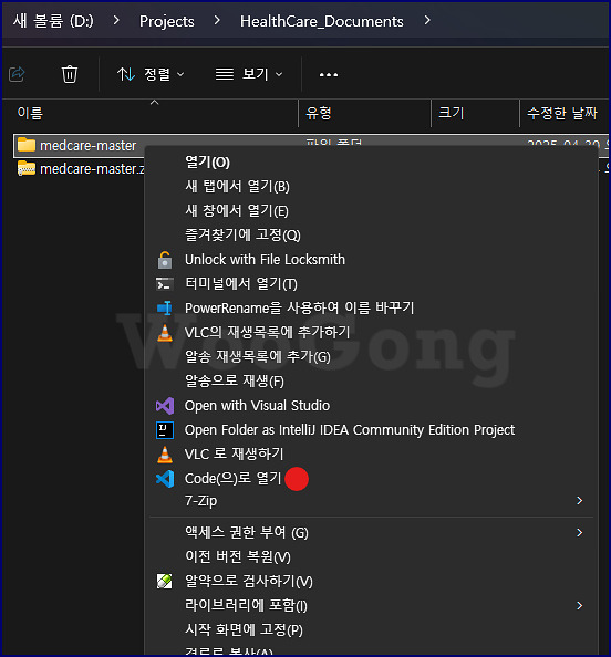 Source 를 편하게 보기 위해서 Visual Studio Code 로 열어서 보겠습니다. Download 받아 압축을 푼 폴더를 마우스 오른쪽 클릭을 하면 나타나는 Context menu 에서 "Code(으)로 열기" 메뉴를 클릭합니다.