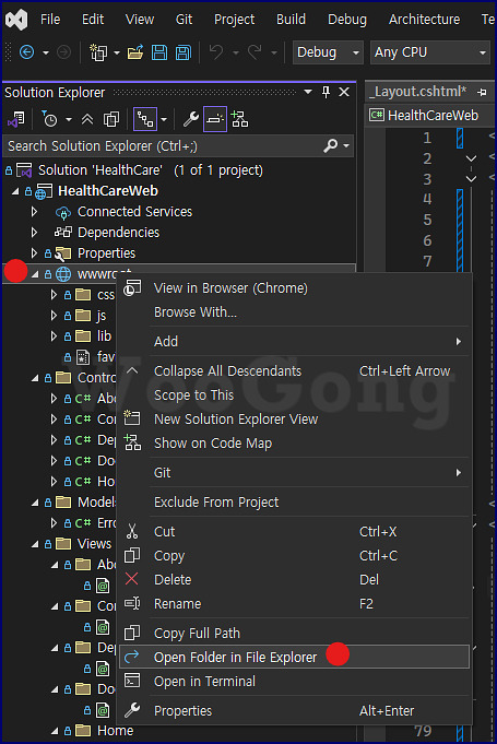 그리고 Visual Studio 2022 의 Solution Explorer (솔루션 탐색기)에서 wwwroot를 오른쪽 click 하여 "Open Folder in File Explorer(파일탐색기에서 폴더열기)" 를 cliek 합니다.