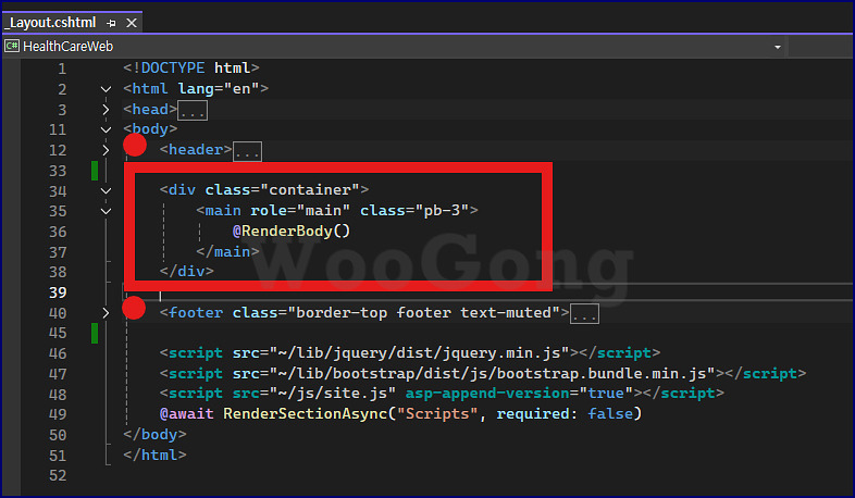 아래 처럼 _Layout.cshtml 파일을 보면 사각형 내의 @RenderBody() 를 보실 수 있습니다.